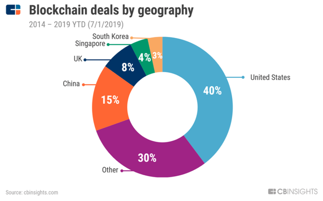 In the last five years, global blockchain startup investments have been targeted mostly at US companies, which attracted 40% of the money. Chinese startups got 15% of the funds, while 8% went to the UK, 4% to Singapore, and 3% to South Korea. The other countries received 30% of the VC money.