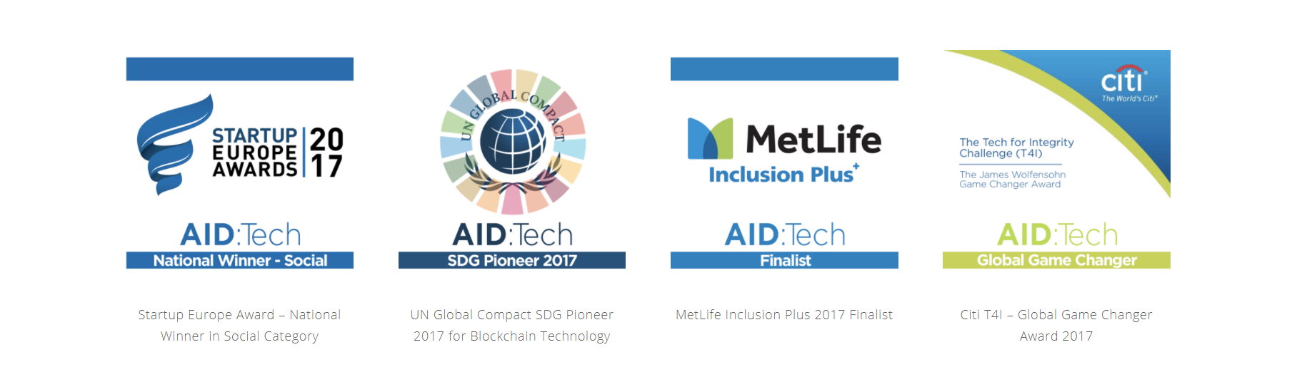 They've also been busy winning an impressive amount of awards and did especially well last year: IBM's #1 Global Startup (2017), Citi Tech4Integrity Global Game Changer Award (2017), Startup Europe Award National Winner in Social Category (2017), and UN Global Compact Sustainable Development Goals Pioneer for Blockchain Technology (2017).