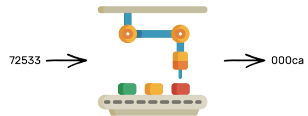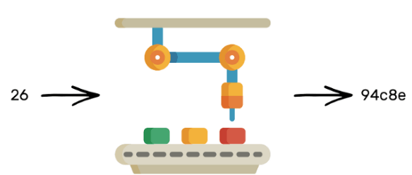 How did it convert the number 4 to this word? No one knows. Moreover, it is an irreversible process. Given the word, ‘dcbea,’ it is impossible to tell what the machine was fed on the left. But every time you’d feed the number 4 to the machine, it will always spit out the same word, ‘dcbea.’