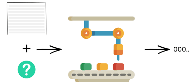 Imagine a machine surrounded by thick walls. If you send a box with something inside it from the left, it will spit out a box containing something else.