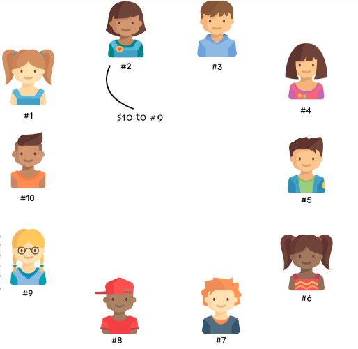 To make the transaction, #2 shouts and tells everyone, “I want to transfer $10 to #9. So, everyone, please make a note of it on your pages.”