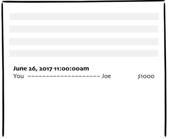He opens up the register, checks your account balance to see if you have enough balance to transfer $1000 to Joe. Because you’re a rich person you have plenty to spare; thus, he makes an entry in the register like the following: