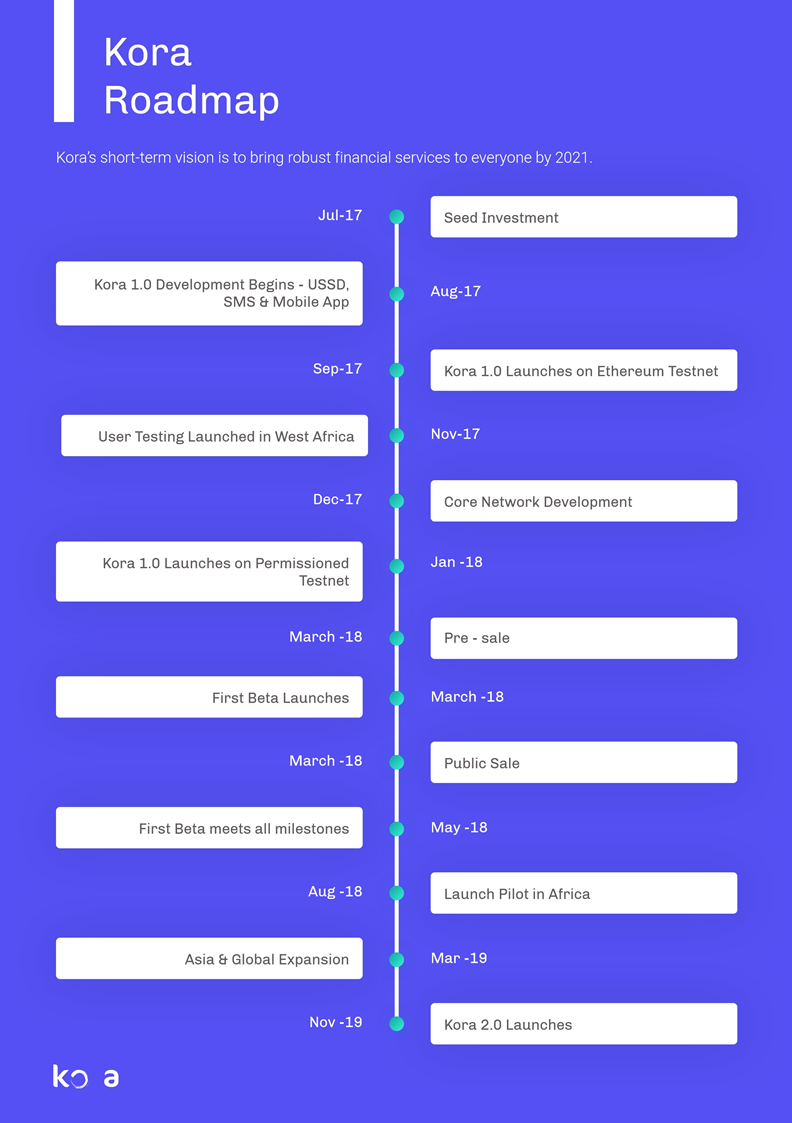 • KNT will be distributed to Contributors as an ERC20 token after the token sale is completed. KNT-ERC20 tokens can be redeemed for KNT on the Kora Network when the public blockchain is launched in Q3 2018.