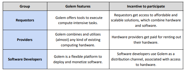 The Golem platform is for software developers as Steem is for content creators. Meaning, software developers can publish their software to the Golem platform in order to monetize it. The payment is done using Golem's token which is also called Golem (GNT). The homepages linked in this post for each dApp usually have an explanation video on their site. I highly suggest checking out Golem's video as it's very well put together and will help wrap your mind around its concept.