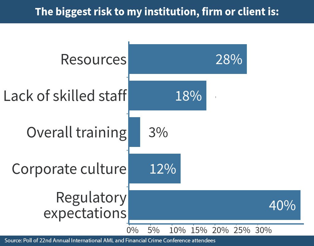 What happens when there is little trust between the regulator and the regulated? Increases in requirements, fines, audits, and their enforcement are pulled in to induce fear of the regulator who may ratchet up any of these efforts at any moment. Regulators may genuinely keep their interpretations broad to adjust to the changing conditions of the money laundering landscape, but the unpredictability of the regulator is toxic to a system based on trust, which disintegrates into one of anxiety and ultimately adversary — between all parties. We see this in the biggest risk concerns for compliance teams: regulatory expectations and resources.