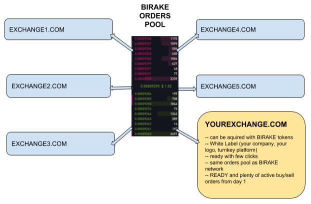 With Birake, Everyone can own their own exchange platform by renting with the help of Birake. All the exchanges using our platform will share their orders meaning a new exchanged rent in the Birake platform will have many buy and sell orders on the first day launching of your own exchange.