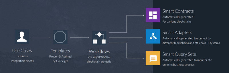 Отличие Unibright в том, что смарт-контракты для конкретного блокчейна и все необходимые объекты генерируются автоматически их платформой, включая соединения с другими системами, такими как SAP или Oracle, или веб-сервисами SOAP, FTP и электронной почтой.