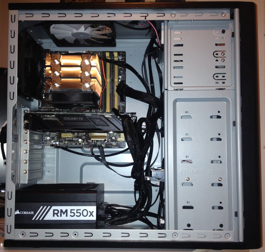 Here's the system as of today after installing the new Power Supply. I got myself to do some cable management which seems fine considering the case wasn't designed with cable management in mind.