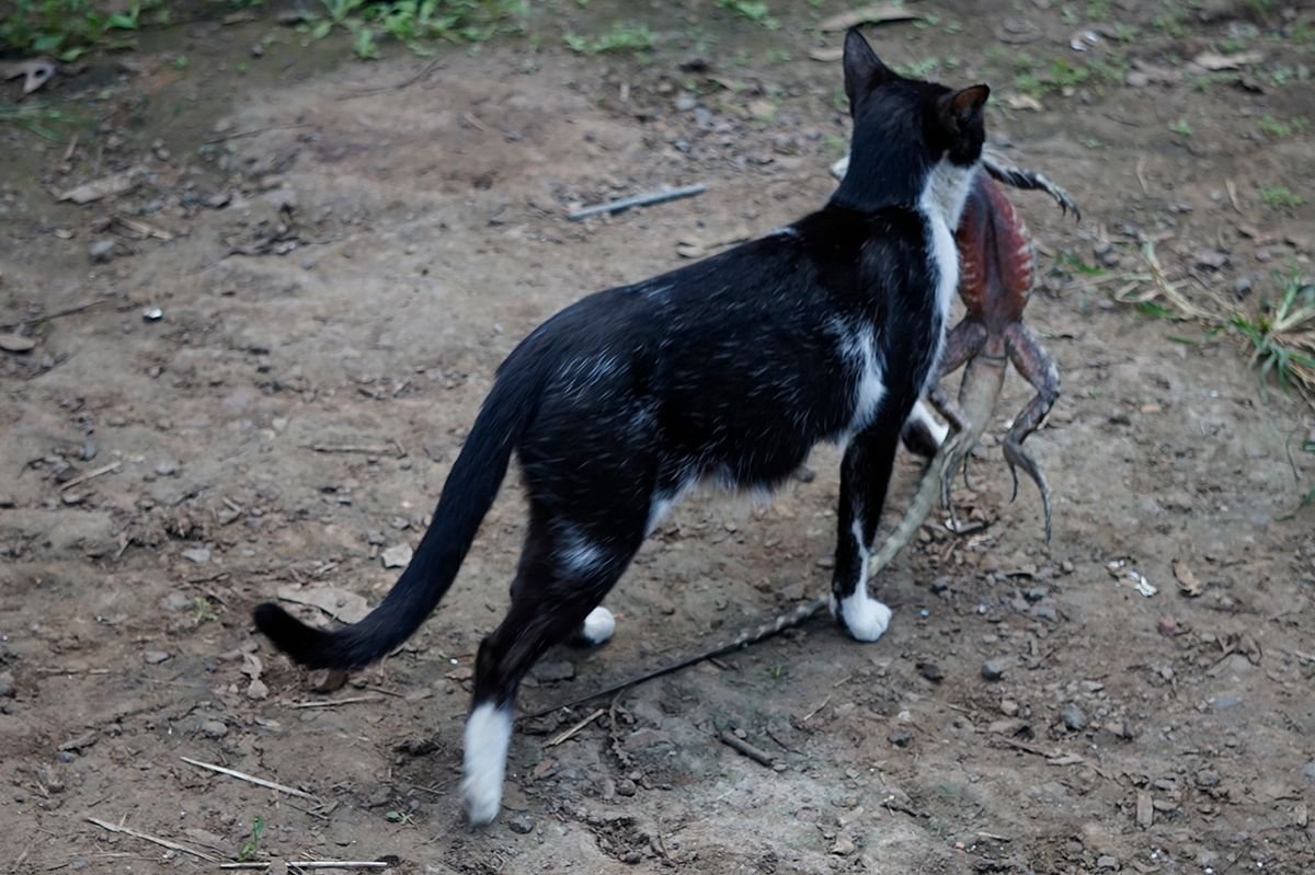 사실 미니가 다른 동물을 사냥한 것을 본건 이번이 처음도 아니었다. 한 2주 전 몸집이 꽤 큰 수염 드래곤 도마뱀을 잡아 새끼들이 있는 곳으로 물어다 주곤 자리를 뜨더니 거리를 두고 지켜보는것을 본 적이 있다. 그 때 도마뱀은 거의 숨만 붙어 있던 상태였고, 새끼들은 건들이면 약간 꿈틀거리는 도마뱀을 그저 신기한 듯 툭툭 건들여 보고는 흥미가 떨어지자 자기네들끼리 장난치며 놀았다. 나는 수염 드래곤 도마뱀 몸집이 그 정도로 큰 것은 본적이 없었기에 신기해서 사진으로 남겨보려고 집안에 있던 디지털 카메라를 얼른가져와 (몸집 사이즈 비교를 위해) 휴대폰을 도마뱀 옆에 두고 사진을 찍고 있는데, 미니는 내가 먹이를 훔쳐갈 것이라고 생각을 했는지 숨조차도 끊겨버린 도마뱀을 물어다 어디론가 사라졌다. 아마 그때 미니가 새끼들에게 야생에서 먹이를 먹는 법을 본격 적으로 가르쳐주기 시작한게 아닌가 싶다. 그 후에도 몇 번 들쥐 새끼를 잡아서 새끼들에게 주는 것을 보았다. 이 때 까지만 해도 그렇게 충격적으로 다가오지 않았었는데 그게 먹다 남은 동물에 시체를 본적이 없어서인지 친근하게 느껴지는 동물들이 아니여서인지는 잘 모르겠다.