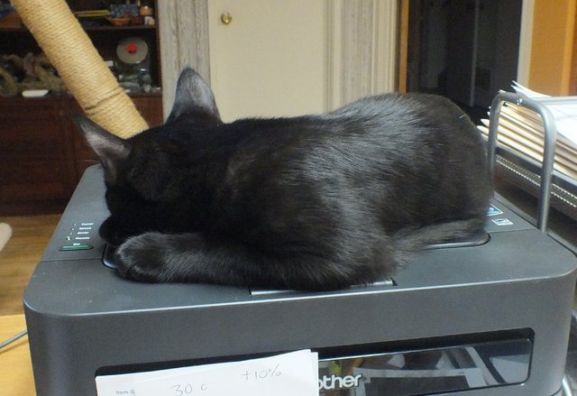He follows me around a lot when I'm home-- often helping me do creative/art things. When I am at the computer writing (like right now) he tends to curl up and go to sleep on the printer.