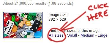 First I dragged and dropped my image into the Google Images search box. I then had the option to search for different sizes of the image. Because I wanted to find all instances of usage found on the web to date, I clicked on All Sizes. It's important that you choose that option!