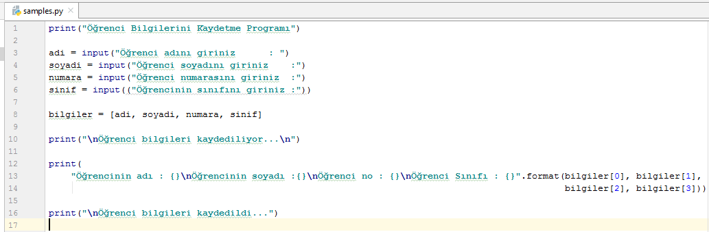 Örneğimizde ilk olarak input() metodunu kullanarak kullanıcıdan aldığımız ad, soyad, numara ve sinif bilgilerini adi, soyadi, numara ve sinif değişkenlerine atadık.