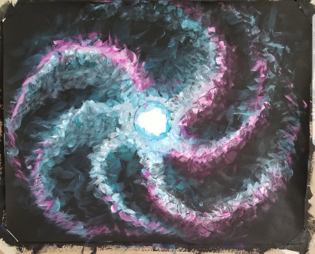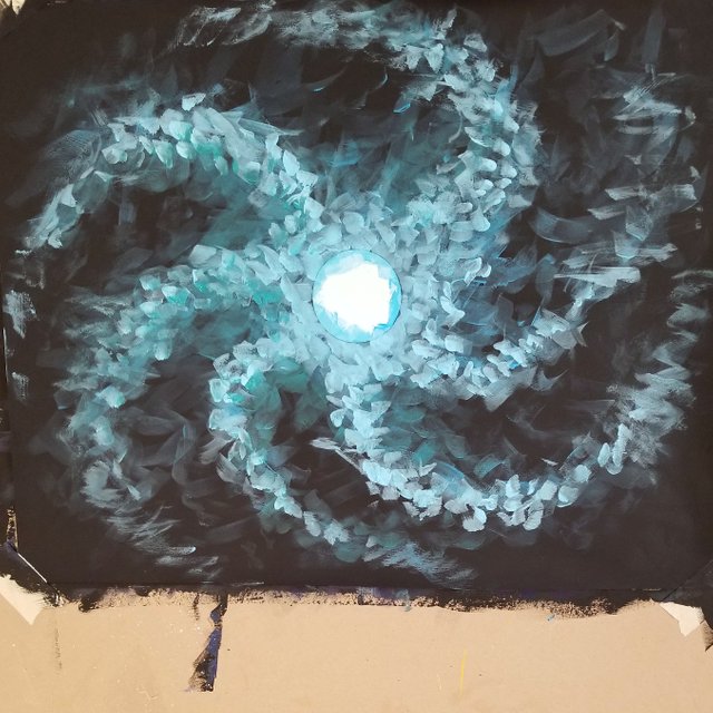 In the first photo, you can see that I began laying down some groundwork with light and translucent shades of blues and greens. Everything seemed to be going so well. The white circle in the center is a piece of paper that's been taped on to the piece. I intend to peel it off at the end to maintain a pure black circle in the center of what's going to be a swirling galaxy.