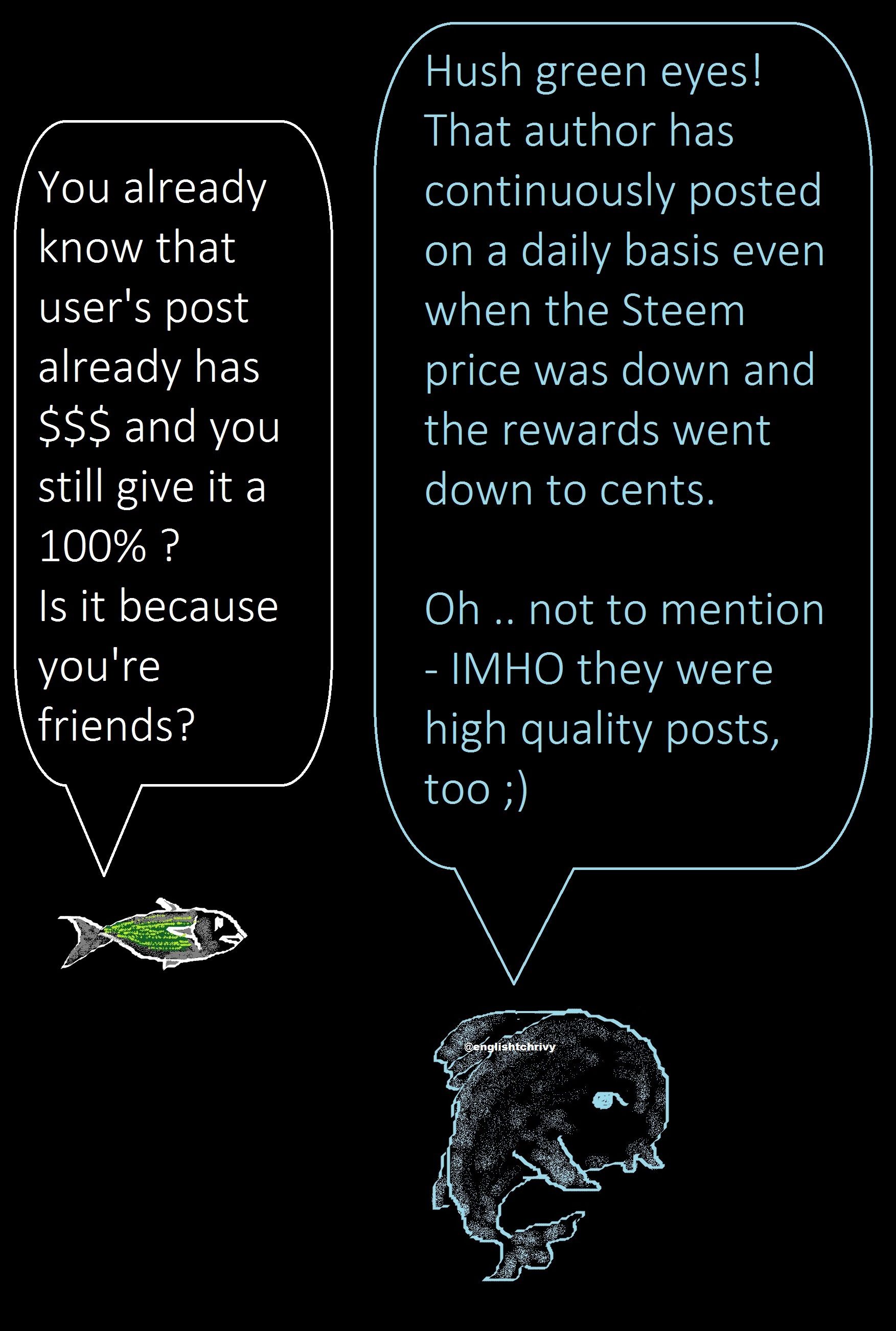 Have you ever wondered why someone upvotes your post or .. not really ... despite the fact that you upvoted theirs? Have you ever asked someone in the chat about it? How dare you! Well.. kidding aside .. many newbies are probably wondering about it. Let's hear what the fishes have to say :)