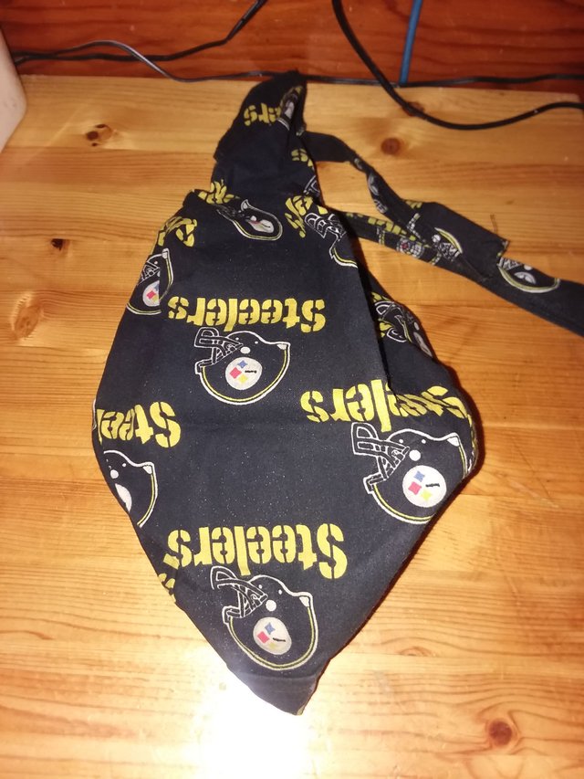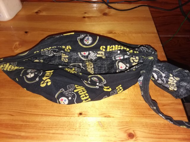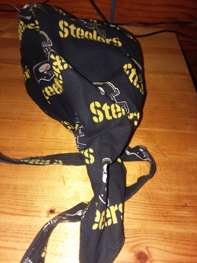 No Buckeyes this week so going with the Steelers instead. This is a bandana a friend of mine made for me. Her husband and myself used to bar tend during the Steeler games. If it was an away game he did the bar tending. If it was a home game he went to the game and I filled in. Well never had a hat to wear. Not because I didn't want one but because I have a big head. Big as in hats don't fit. So she made this for me one Christmas. I wore it to the bars for the games for years before retiring it.