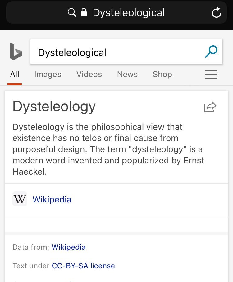 It’s a lovely word, dysteleology. But I needed to look it up to fully grasp what it was created* for: