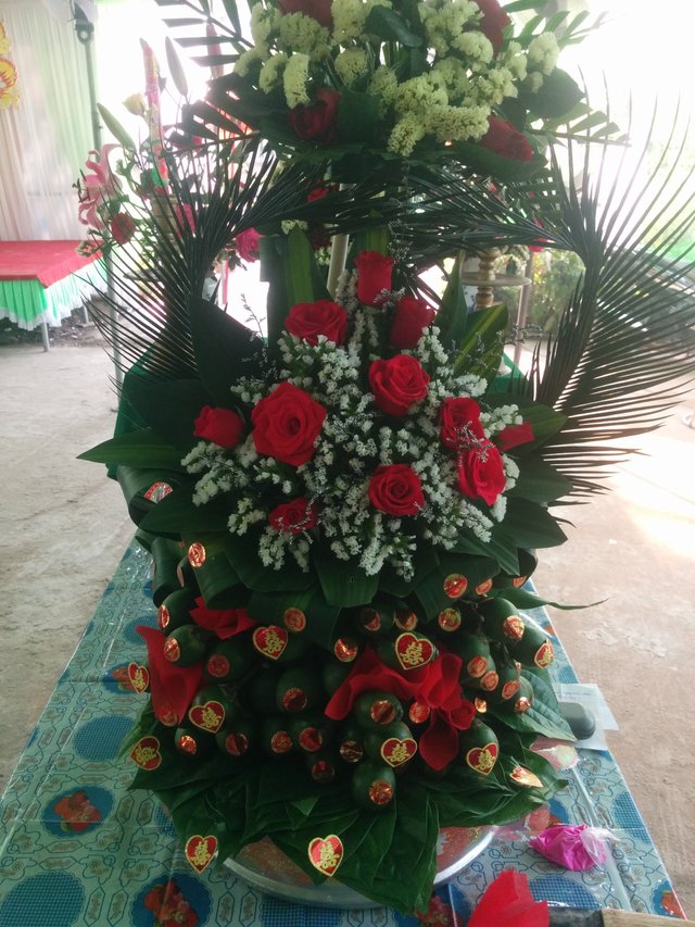 The immediate family members line up behind the bride and groom, carrying two gold bands and an envelope with a gift. They hand the envelope to the couple and place a ring on each one's hand. The parents will give some advice regarding the pending marriage and even more gifts will switch hands, such as jewellery, fruit, and cakes.