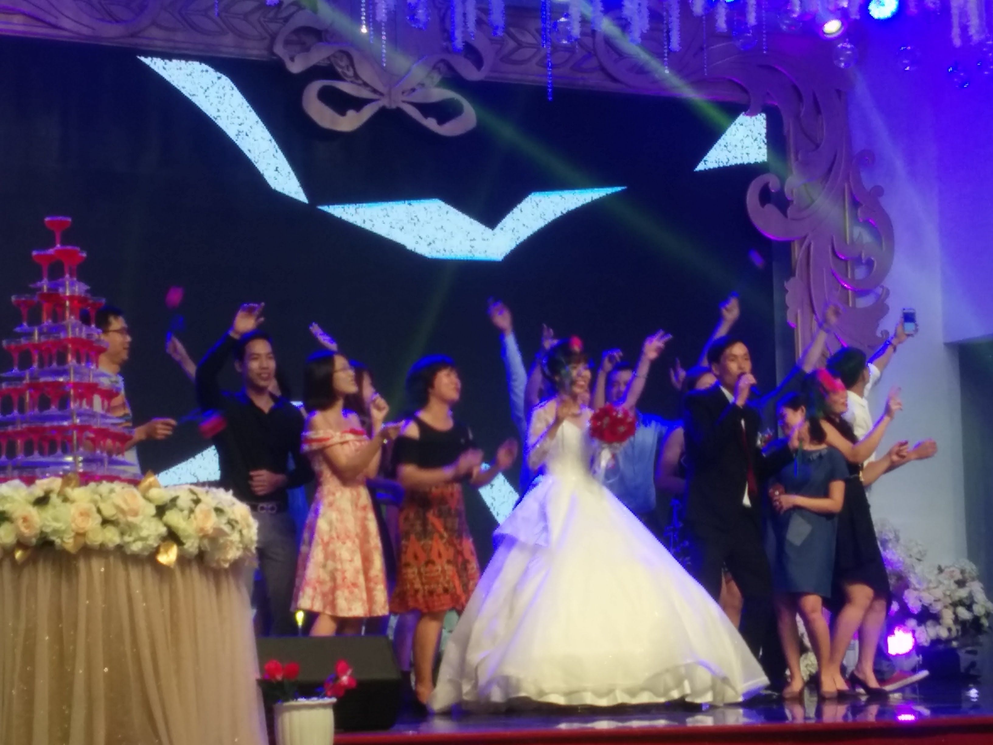My friend gets up on stage and grabs the microphone. It's time for him to serenade his wife with his rendition of You Look So Beautiful In White. It was cute and by the end of the song he had a group of his family up on the stage singing, dancing, and throwing roses around with him as he poured his heart out in those lyrics. Upon finishing everyone in the room witnessed their first kiss (ever?), which was only partially awkward to watch, signalling the finale of the reception and the wedding as a whole.