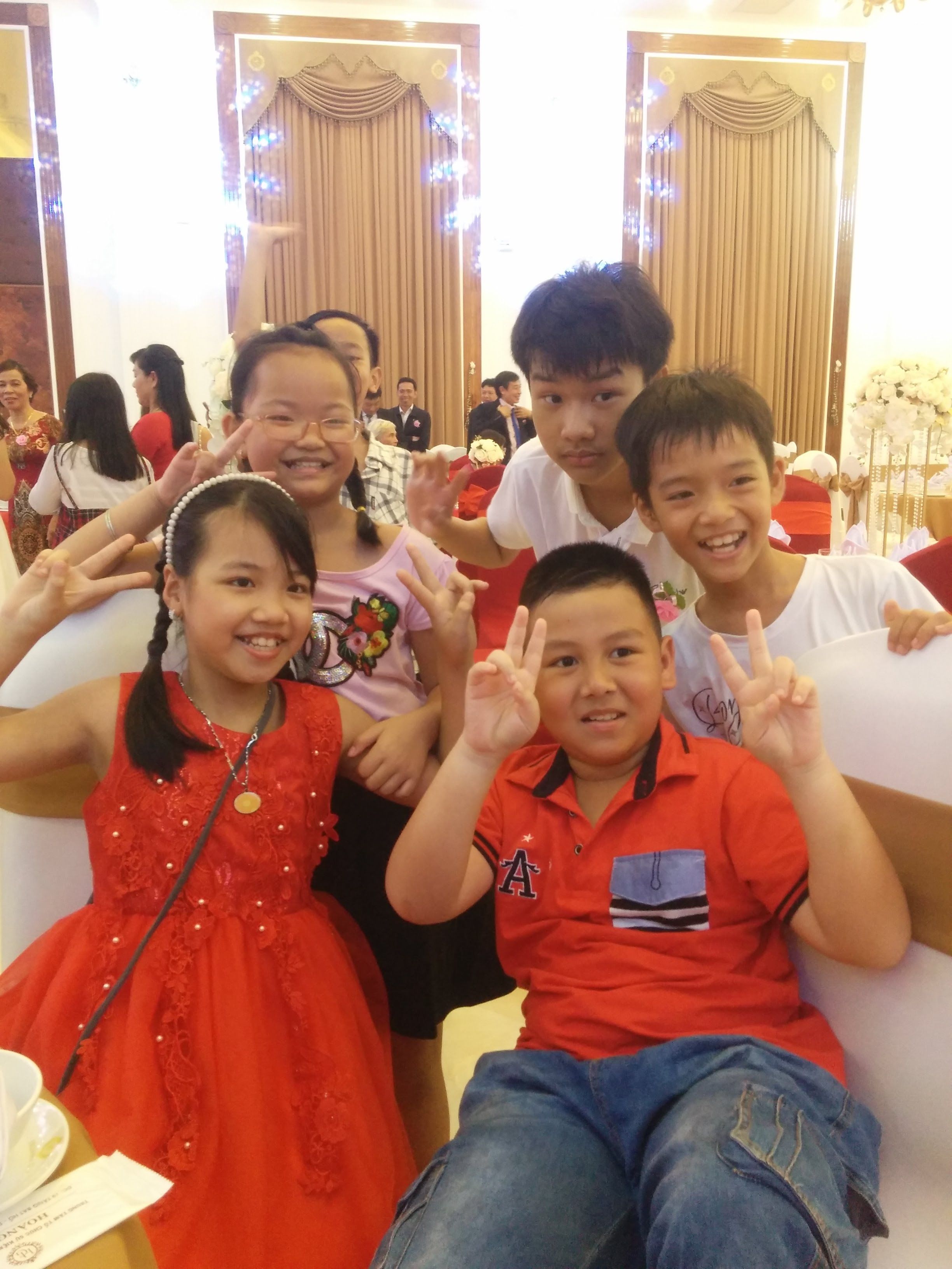 The restaurant was a beautiful and large venue to host the reception with a massive stage at the front of the room, decorated to the nines with lights, streamers, balloons, and a huge screen with wedding pictures of the couple. We sat at the front waiting for people to arrive and things to get underway. While waiting we were surrounded by a group of children who were extremely excited to practice their English with two native English speakers; we were more that happy to entertain the children in the mean time. Most of their questions were asking our names, where we're from, how old we are, and our favourite foods. This is where we garnered the nickname 'ăn chay' which was the running joke amongst the kids for the remainder of the day.