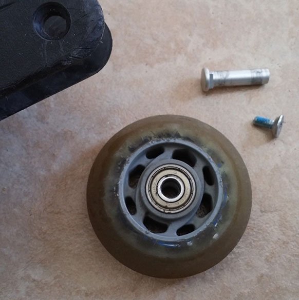 After taking out the axle completely, you can pop the wheel out as well. Then you're left with the axle, the screw, the wheel and an empty spot in your rollerblade plate: