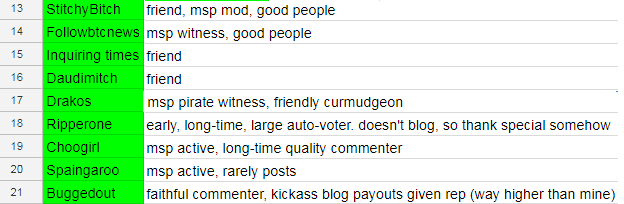 This task required creating a (color-coded) spreadsheet and looking at the posting frequency of all my voters and commenters - a task which I suggest everyone do if they are setting up Steemvoter themselves. Fro me, it took the better part of this last week, and even so, I will need to scale up my vote percentages over time as I see how accurately I calculated the average posts per day of each user, and how many users stick to their recent trends in that regard.
