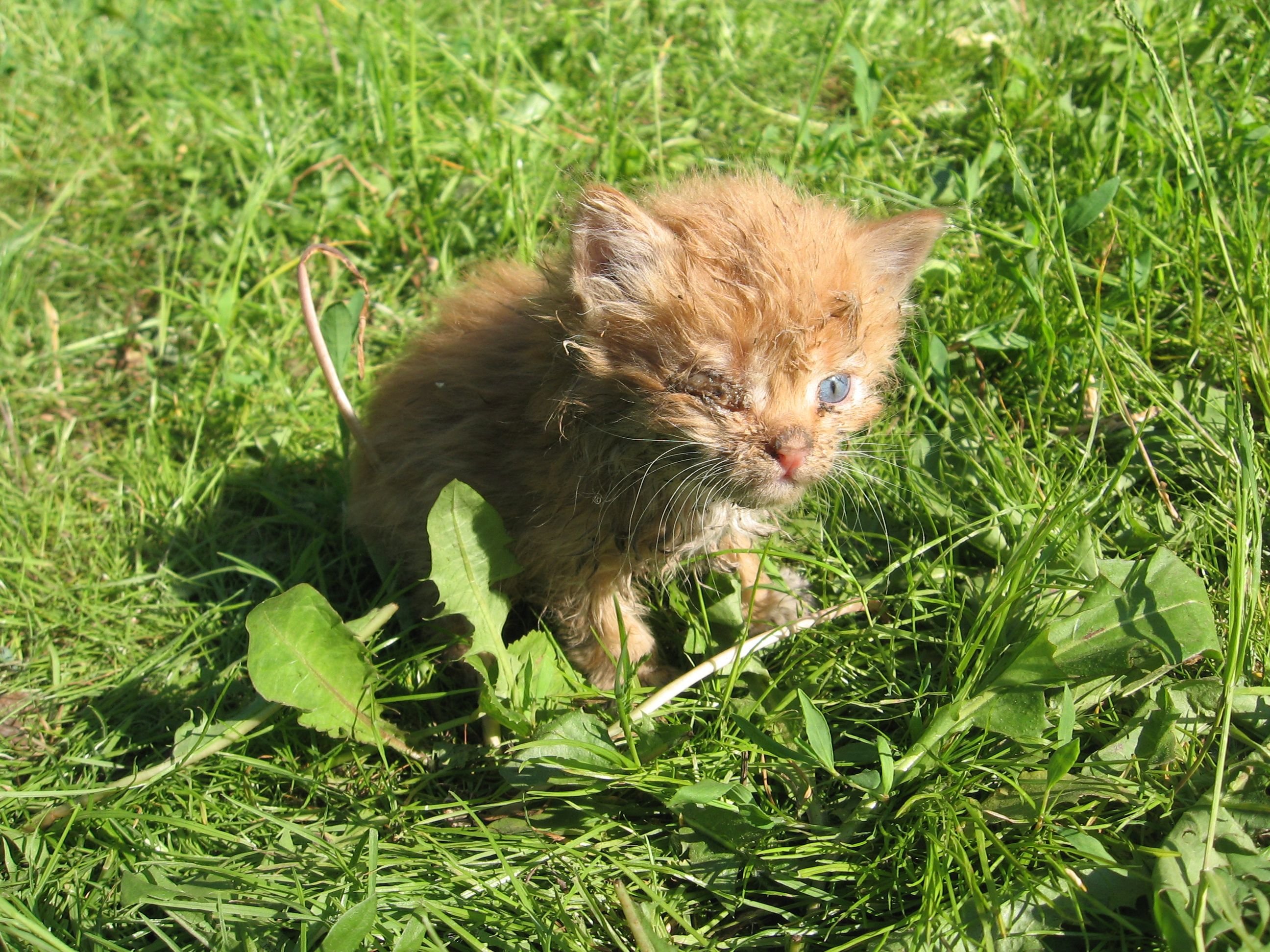 I found this little squeaking lump under the bush on the way from work. It was still light, but rather cold, it was raining and I wanted to quickly get to the warm sofa and a cup of hot tea. Many passed by this little red lump of despair and pain. Some even screamed: "Phew! Whats a freak!" I could not help but pick him up. I put the kitten under my jacket and brought it home.