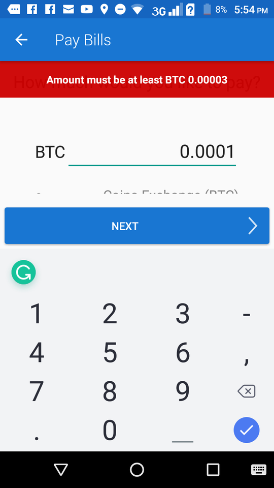 - Enter amount, click 'NEXT' and 'SLIDE TO PAY'. Minimum is 0.00003 BTC to date.