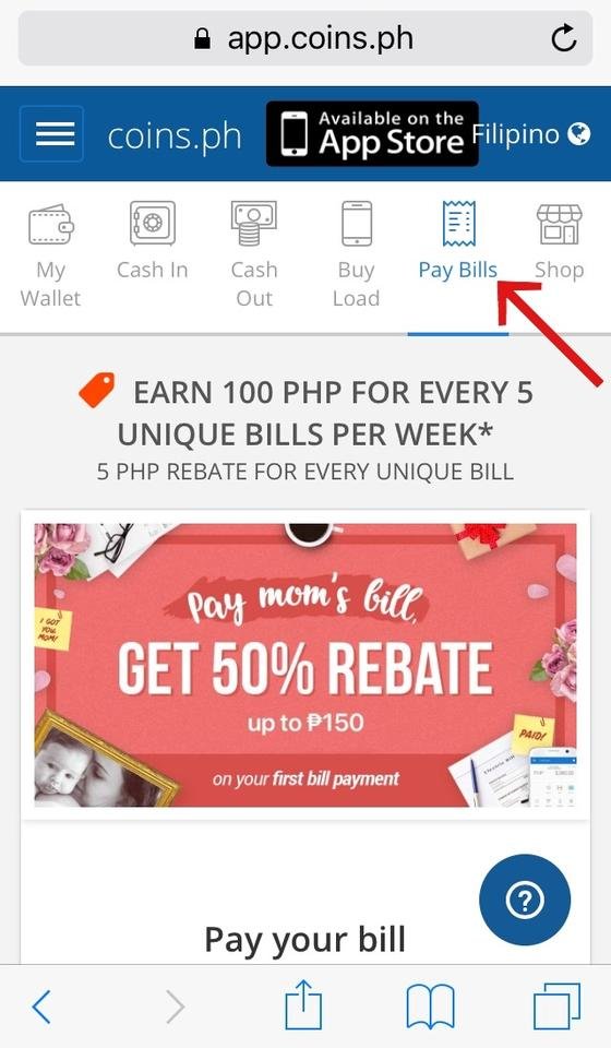 - From Coins.ph desktop/mobile browsers or app, select "Pay Bills".