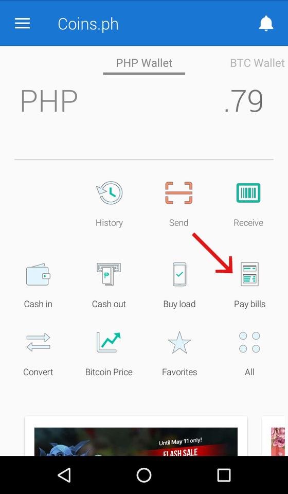 (1) From Coins.ph mobile app or browsers, click "Pay Bills". I used android app this time. I only used the laptop to activate my cx.coins.asia account.