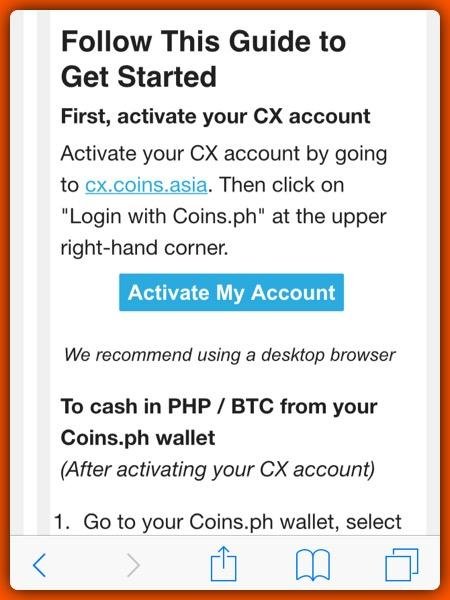 I followed the 'Guideline' given by #CoinsPH via e-mail using the laptop. I clicked the "Activate My Account" button and logged in to Coins Exchange (CX) using my Coins.ph details.