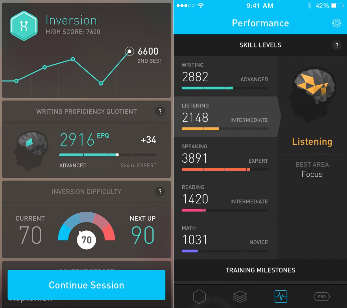 Improve your skills ( listening, speaking, writing ) with Elevate "game workouts". It tracks your progress and users get unlimited access to games, unlimited plays and more analysis on their performance.