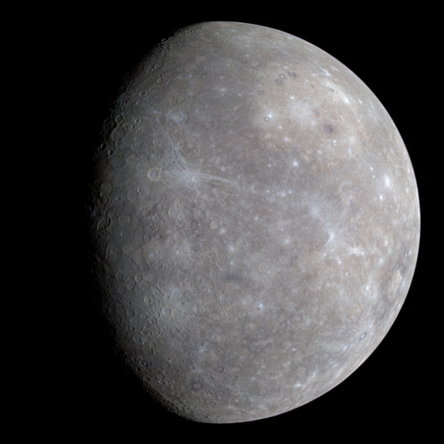 Mercury in enhanced color, imaged by MESSENGER (2008)