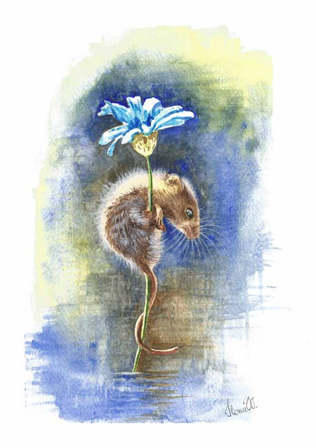 Original watercolor painting Mouse on blue cornflower stem