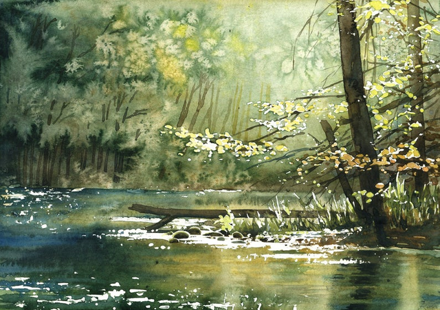 Shine ORIGINAL WATERCOLOR PAINTING water river lake forest