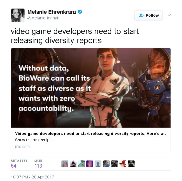 Melanie Ehrenkranz: What happens when developer X releases their “diversity” report and they don’t meet your or any other social justice or feminists criteria? Do they get a scarlet mark next to their names? Do they get named and shamed? Or boycotted? Who decides on what the benchmark should be? My second question would be: Does a diverse development company really correlate with better sales at the end of the day? If so some data to back it up would be really nice. Here is the issue I have with your comment, does adding more woman, POC or any other sexual orientation add value to the company or game design when it is being pushed or forced onto developers and publishers? I would say no, pushing our medium to make better games won’t happen when you are forcing these companies to tick invisible diversity boxes.