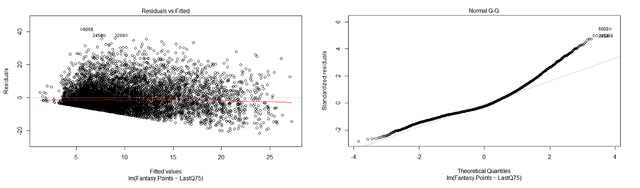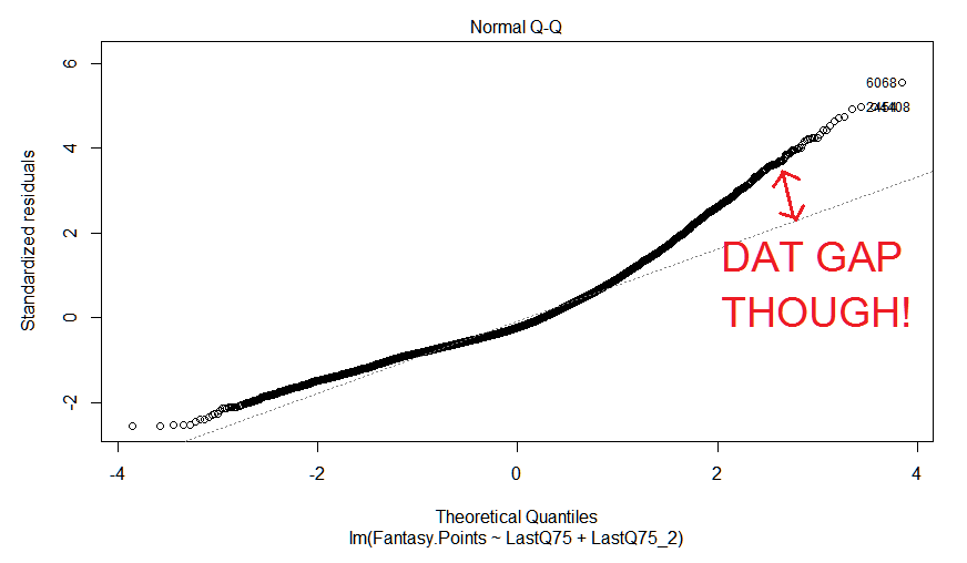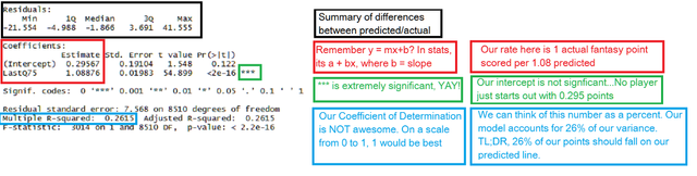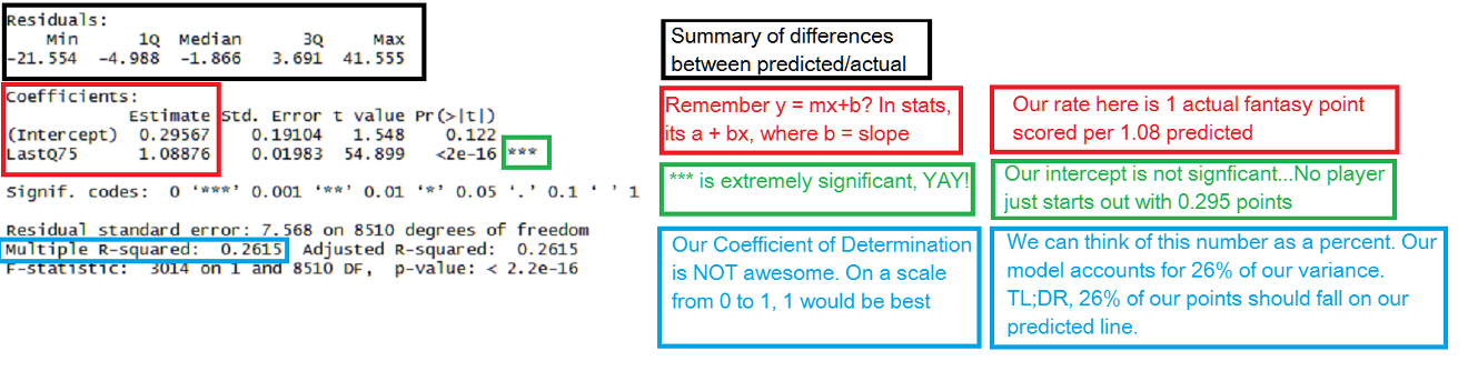 Below is the summary of our linear regression. Notice here that even though we were spread apart, our LastQ75 is rated by the computer as mattering, meaning it does have high significance towards explaining the randomness of a future fantasy performance. How much so? Basically 26%.