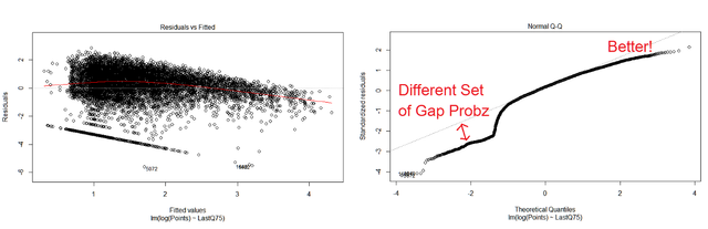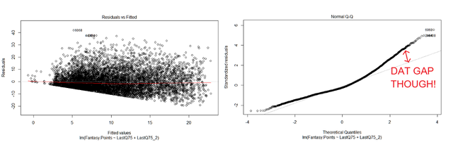 The graph on the right is basically a different way to view this information in terms of the spread of our residuals. Are our residuals are nicely spread apart, or do they deviate severely from our perfect zero? We want to be on the diagonal line on this plot. Our biggest gap is to the right, with our high predicted point value players, as predicted prior.
