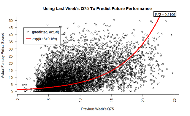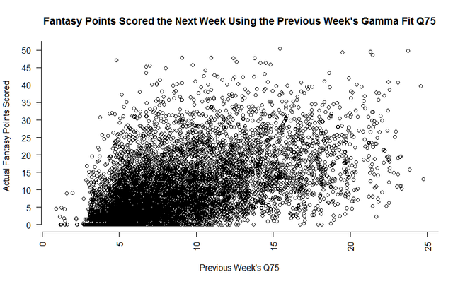 Above represents every predicted NFL fantasy performance 2014–2015 (almost 8,000+ in total) using a players Gamma Q75, and the actual points they scored that week. The point (20, 40) on this plot means if I predicted they would score 20 that given week, they actually scored 40.