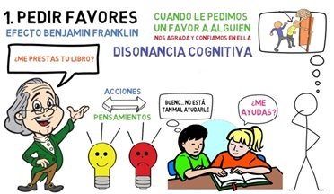 - Ask for small favors: Maybe it sounds a little weird, because you think you should be the one who does good things for others, but the reality is that when we ask a favor from someone, the other person perceives that we like and that we trust in her, this trick has as its name Benjamin Franklin since he applied it with his adversaries as a strategy, this behavior is caused by the cognitive dissonance that occurs in our brain. It works in the following way: When we do a favor to someone that we do not like very much, an internal conflict is created because our actions do not agree with our thoughts, so what the mind does is look for a justification of why we are doing it . Cognitive dissonance is a subject deeply studied and highly recommended for the success of interpersonal relationships. So you already know!!! If you want to like someone ask a favor XD.