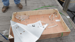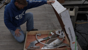 The 85-lb Mantus Anchor arrived in a wooden-bottomed box with all of the pieces tied down with cloth strapping. We opened the box revealing 6 heavy-duty bolts, lock-washers, and nuts. Also inside, and filling the box, were three disassembled pieces: the fluke, the roll bar, and the shank. The anchor also included 4-5 packets of heavy-duty lubricant, and a set of instructions. We could see immediately that the quality of the anchor was outstanding and this thing is a beast y’all! It glistened in the early-morning sun, and we were excited to get it installed.