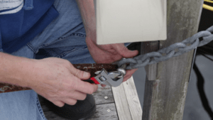 Cole took hold of our existing Delta Anchor and, with Shannon releasing the windlass, pulled it onto the dock. I got out a pair of needle-nose pliers and removed the safety, seizing wire on the anchor shackle. With a couple turns of the adjustable wrench, the shackle bolt came free and we released it from the shackle. Cole moved the Delta out of the way and we worked together to move our new Mantus Anchor in line with the bow.