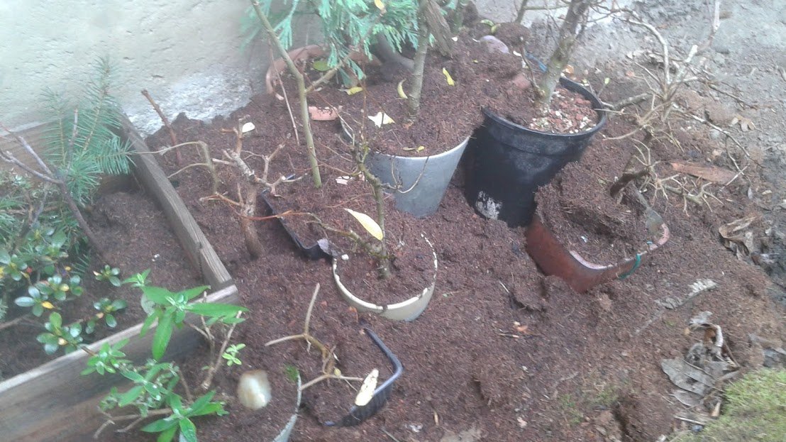 - Cover with a heavy layer of mulch. Most bonsai growers recommend using wood chips or barkdust. I like to use coconut fiber because it is cheap, and I can use it again in the spring as a soft medium growing vegetables in. Whatever kind of mulch you choose, it should be able to absorb water, but not so much that it becomes mucky or muddy, as this may cause your trees to rot. Rock mulches are also insufficient as they will not retain enough water to feed the plants during the many dry weeks that happen in winter (although rock mulch might be good if your winter has a monsoon climate!). Leaves are not ideal as they may dry out or blow away, and you need a mulch that stays put, and stays slightly moist.