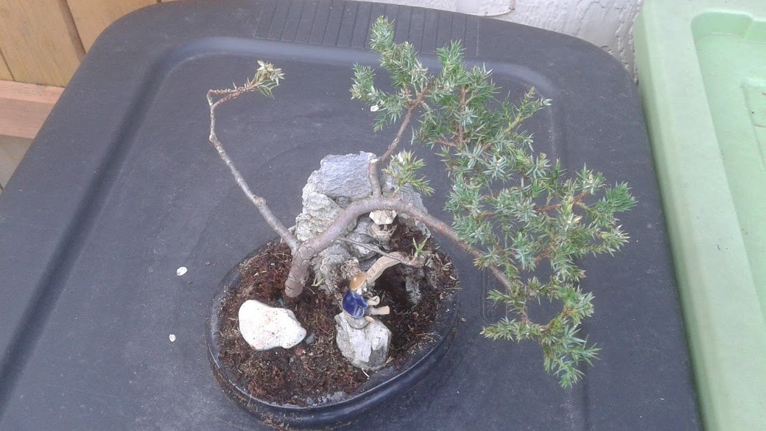 I do know that this tree likes being near water sources, like a fountain or bird path in the yard. While a full grown Juniper loves being in full sun, this tree has very shallow roots inside a dark pot, and so it prefers a slightly cooler, slightly shady spot in the yard. One of the advantages of the pot it is growing in, is that it has a built in area separated from the tree for a fresh water pond feature. This is the only pot I have that combines the tree, the rock feature, and a water feature all in one.