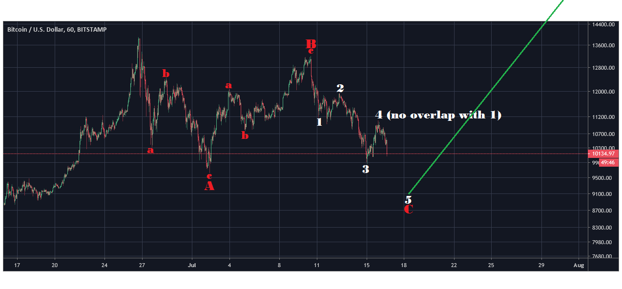 The targetzone (between major fib targets) is 9500$-8600$ for this ABC (flat) pattern. If we see an extreme wave 5 of C, 7500$ would be possible, but I think that this is unlikely, because of the way this pattern developed.