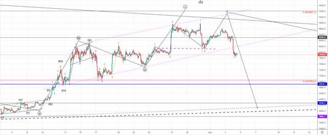 From yesterday’s high at $8742, the price of Bitcoin has decreased by around 10% today as it came down to $7856 at its lowest point. Over the weekend we have seen the price reaching $8970 and has expected to continue potentially increasing for another minor higher high and interact with the 0.382 Fibonacci level at around $9400 after the higher degree downturn starts.