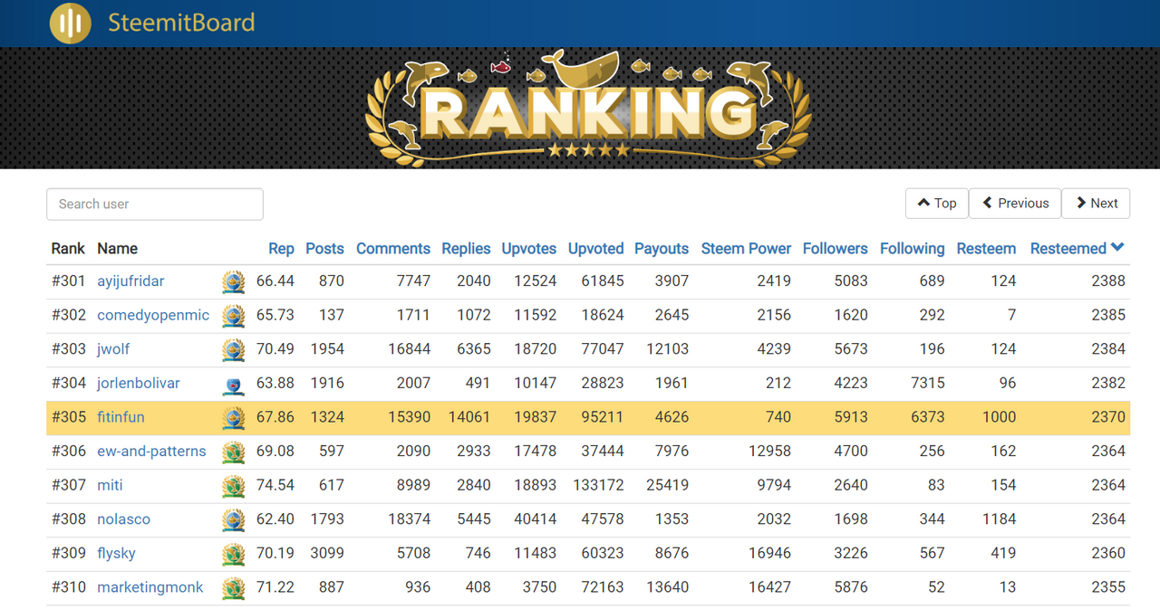 This view shows that I am number 305 out of all steemers on resteems. I am sure this is because of all of my minnow tips posts that get resteemed by redfish constantly. Now that I have ginabot I see the resteems happen in real time.