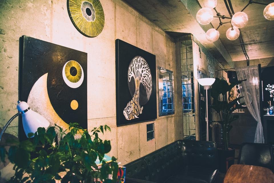 느낌가게 문을 열고 들어갔을 때 아트작품이 눈에 들어왔습니다. 입구 왼쪽 벽에 큼직한 아트웍이 걸려있고 카운터 오른쪽에는 작은 크기의 일러스트 작품이 전시되어 있습니다.