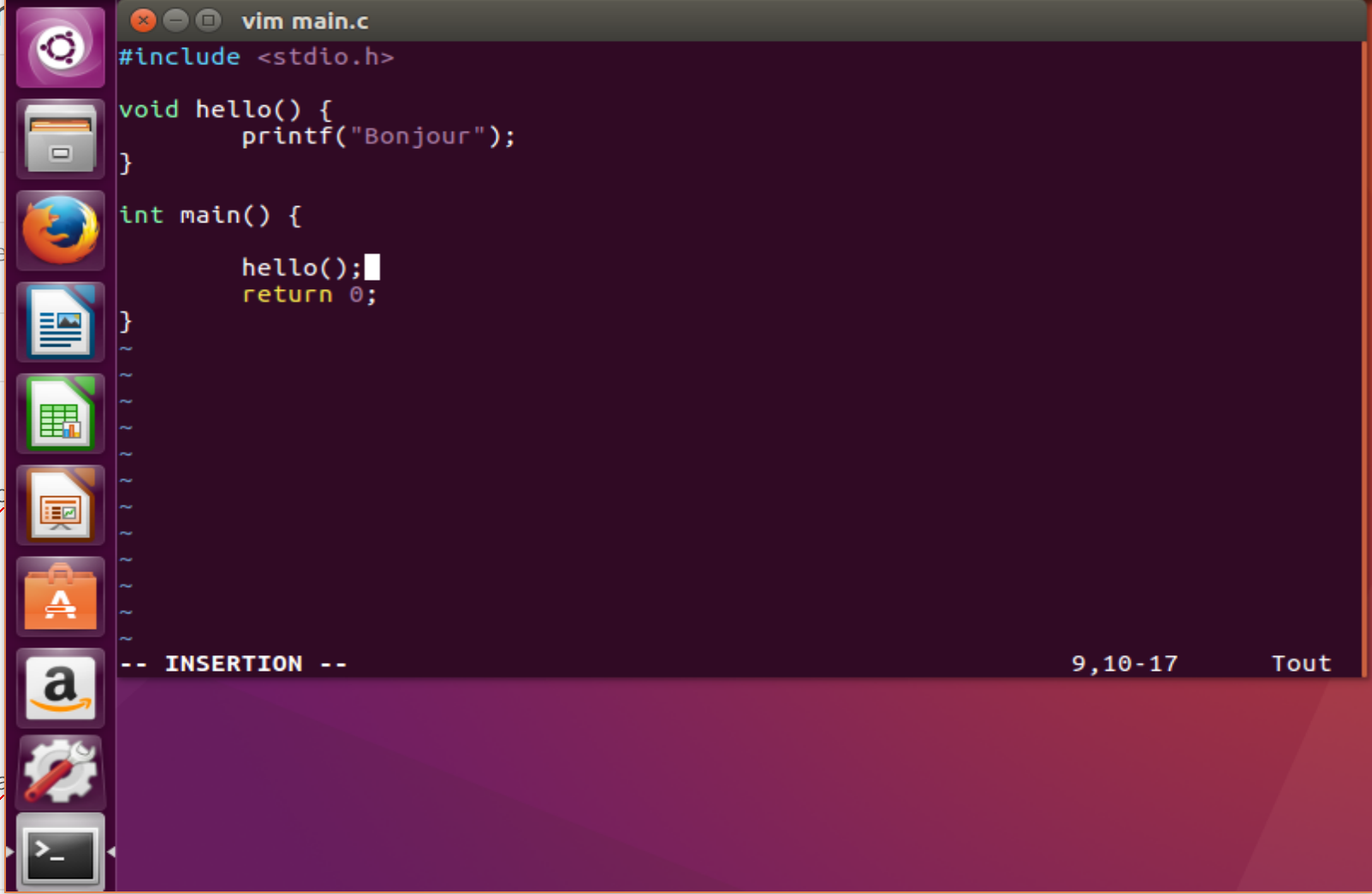 Je vais donc commencer par créer mon nouveau fichier à l'aide de vim. Il ne faudra pas oublier de mettre l'extention .c à la fin de votre fichier. Par exemple, pour moi : vim main.c. Ok bon dernière chose importante (oui je suis désolé pour les plus avancées, j'ai promis de faire un cours pour tout le monde), Les pemières lignes de votre code .c doit contenir les librairies que vous allez utiliser. Nous verrons à qui servent ces librairies plus bas dans le cours. Vous devrez ensuite penser à mettre un int main(). Vous allez comprendre.