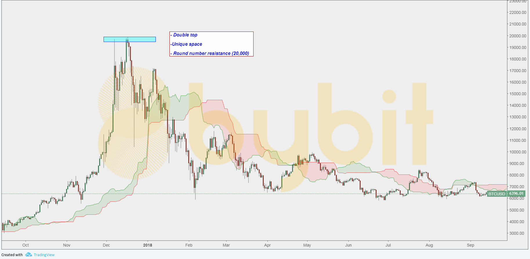 In addition to this, it is important to remember that reversals will often occur in unique spaces on the chart; i.e. an area which price has not visited before. A very recent example, which is shown below was the BTCUSD sell off in December 2017, which was a unique space on the chart, double top area and also round number resistance at 20,000.
