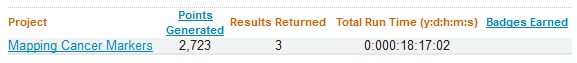 Here are the results of my WCG test runs. I finished 3 Tasks for Mapping Cancer Markers. And I got a whooping 2,700 points for it. Problem is I needed the PC a total of 18 hours to run and complete those tasks (all idle time).